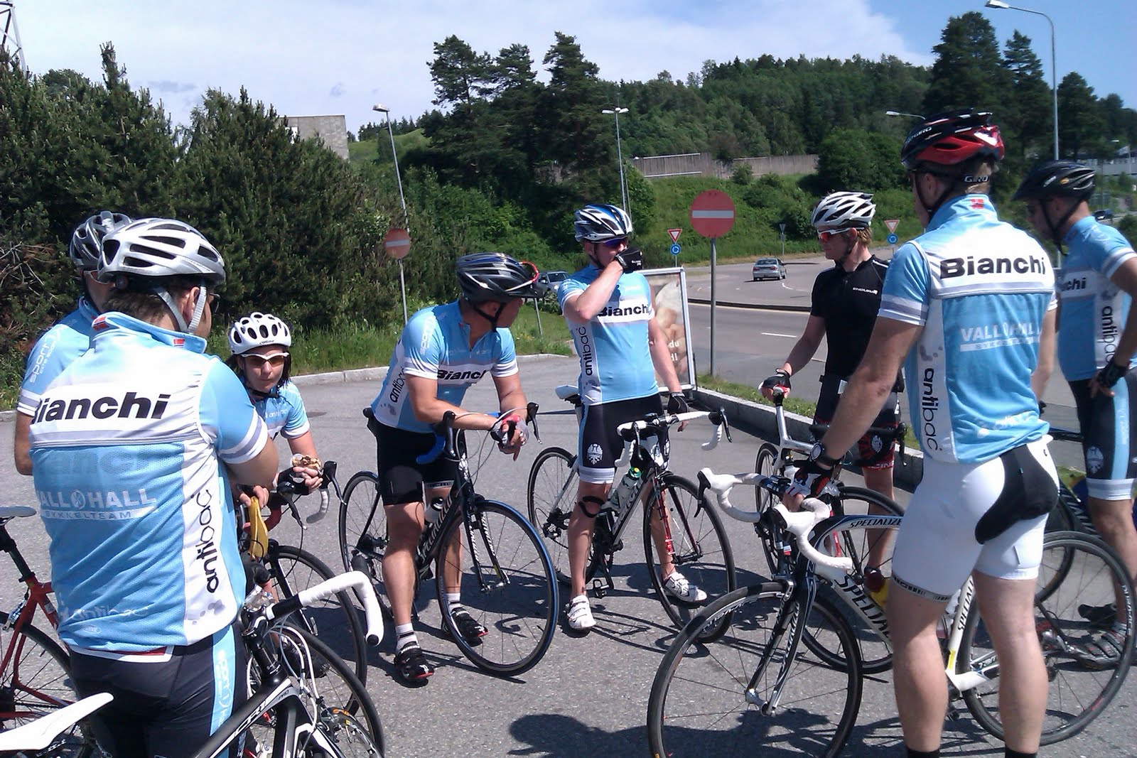I år som ifjor ble det rittrening før Lillehammer-Oslo med Vallhall Sykkelteam på bursdagen min. Pinsen gjorde at vi desverre var litt færre enn ønskelig, men det kommer meldinger om mye egentrening rundt omkring. Rammen med sol og 20 grader var ihvertfall perfekt. Vinden skulle imidlertid vise seg å bli riktig så tung. Begge gruppene kjørte felles fra Vallhall til Kjeller. Allerede etter 5 kilometer oppstod dagens triste situasjon. Da vi skulle svinge inn på en mindre vei oppstod det en litt brå oppbremsing. Desverre førte denne oppbremsingen til at Bente gikk i asfalten og Stein, vår medisinsk kyndige, kunne konstatere brudd i albuen. Maks uflaks for Bente. Jeg føler med deg og håper du er snart tilbake igjen! Fra Kjeller splittet vi gruppene og kjørte nordover til Gardermoen og Jessheim, før vi tok med oss Frognerbakkene på vei tilbake til Kjeller. Målsetning for gruppe 1 var 35 km/t i snitt. Medvind opp, men kraftig motvind tilbake, gjorde at vi endte de 6 mila med 33,3 km/t i snitt. Bildet: Vi sa oss likevel fornøyd med kjøringen da dagen skulle evalueres, og rullet etterhvert tilbake til Vallhall. Totalt 10 mil idag. Rapportene fra gruppe 2 sier at de endte litt under sin målsetning på 30 km/t i snitt, men at de også var fornøyd.