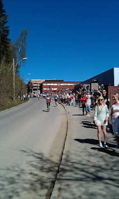 Jeg ble veldig usikker på hva jeg skulle gjøre. For første gang i min korte sykkelkarriere var jeg løs fra hovedfeltet. Det var fortsatt 3 km til mål, halvparten i tung vind. Jeg fortsatte i et ganske rolig tempo og fikk ned pulsen. Var helt sikker på at jeg raskt skulle bli kjørt inn. Men det gikk veldig rolig bak. Ingen ville dra i vinden og alle ventet på spurten. Jeg kjørte på 80% og ventet på at de skulle komme. Sparte litt så jeg kunne henge med når de kom. Da vi vendte til høyre i siste sving og fikk medvind, bestemte jeg meg. Litt over 1 km igjen og nå fikk det stå til. Jeg kjørte på det jeg hadde. Klarte å holde et bra tempo, men stivnet litt på siste 200. Ble passert av to stykker fra 15-16 klassen, men holdt unna for alle i min klasse. Status totalt for rittet ble et snitt på 37,4 km/t og inn ca 46 sekunder bak vinneren.