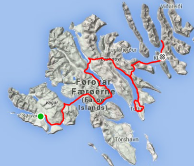 Ruten for første etappe: Start ved flyplassen på øyen Vágoy. Videre via undersjøisk tunnel til øyen Streymin. Så bro over til øyen Eysturoy. Der kjørte vi en runde syd til Toftir. Så nord igjen og gjennom undersjøisk tunnel til Klaksvík. Til slutt en liten runde nord til Haraldsund og så tilbake til målgang i Klaksvík.