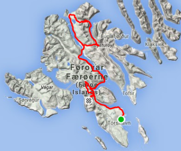 Ruten for andre etappe: Start i Torshavn. Nordover og over til Eysturoy. Der ble det kjørt en runde. Så sydover samme veien som vi kom og toppavslutning på Sornfelli.